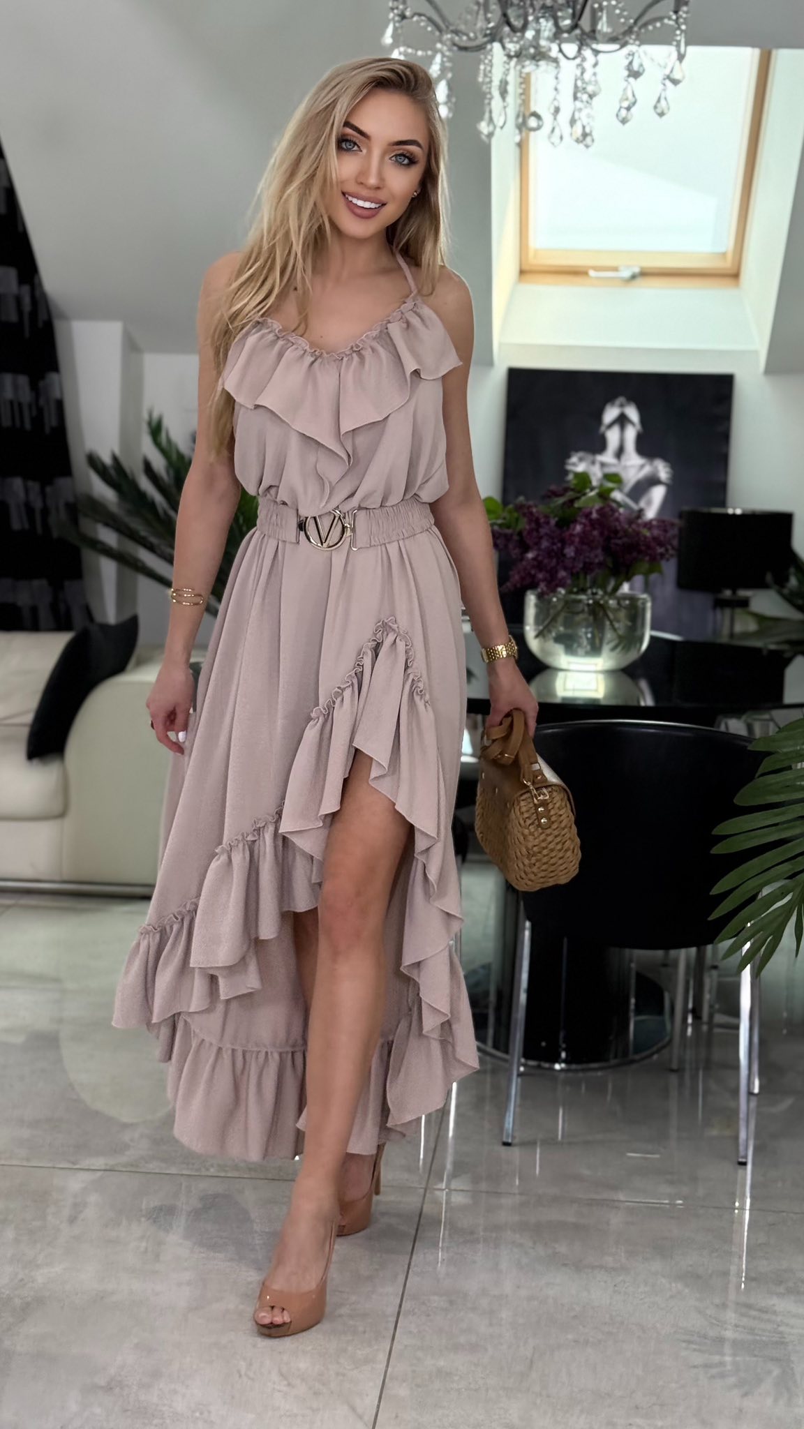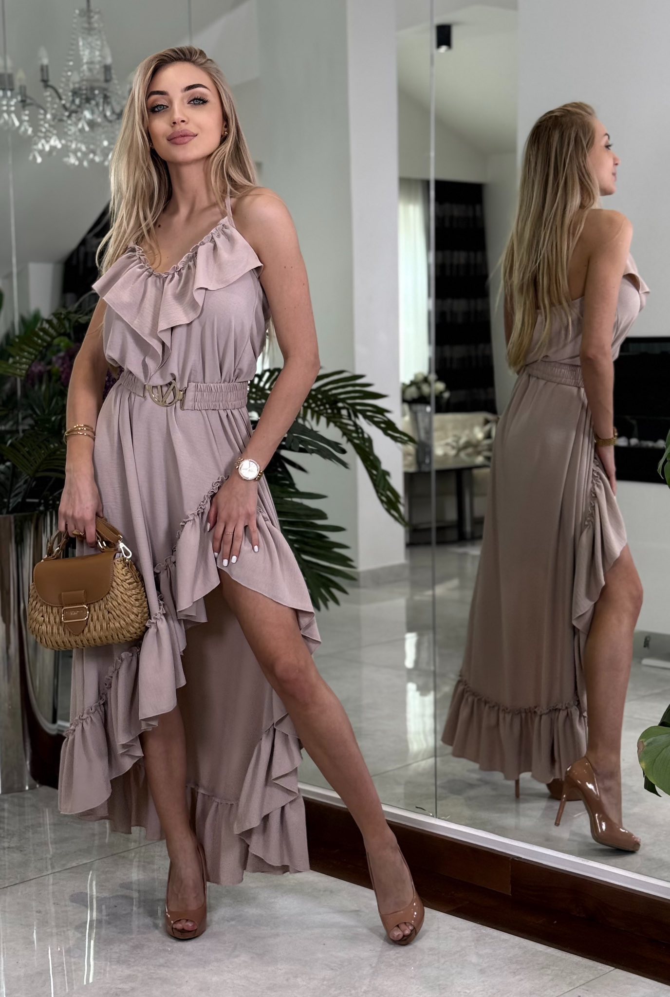 Zmysłowa, lekka sukienka idealna na lato — uszyta z przewiewnego materiału, który delikatnie opływa sylwetkę. Model posiada odkryte plecy oraz wiązanie na szyi, co nadaje mu romantyczny i kobiecy charakter. Przód sukienki jest gładki i elegancki, natomiast asymetryczny rozporek z przodu eksponuje nogę, otoczony delikatną falbaną, która porusza się przy każdym kroku, dodając lekkości i subtelnego wdzięku.
